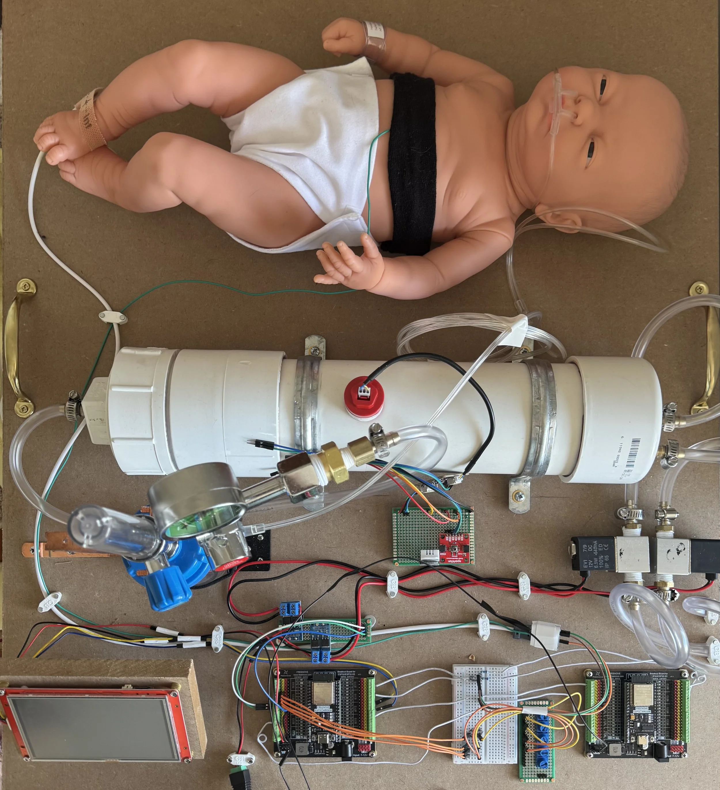 The device integrates an ESP32 microcontroller with high-precision sensors and a touchscreen interface for real-time monitoring and control. A machine-learning algorithm continuously adjusts oxygen delivery using a patient-specific closed-loop model built from recorded physiological responses. By tracking, analyzing, and adapting to individual responses, the system not only improves oxygenation stability but also builds a detailed physiological profile of the patient. This innovative approach enhances the safety and efficacy of neonatal oxygen therapy, representing a significant advancement in critical care technology.