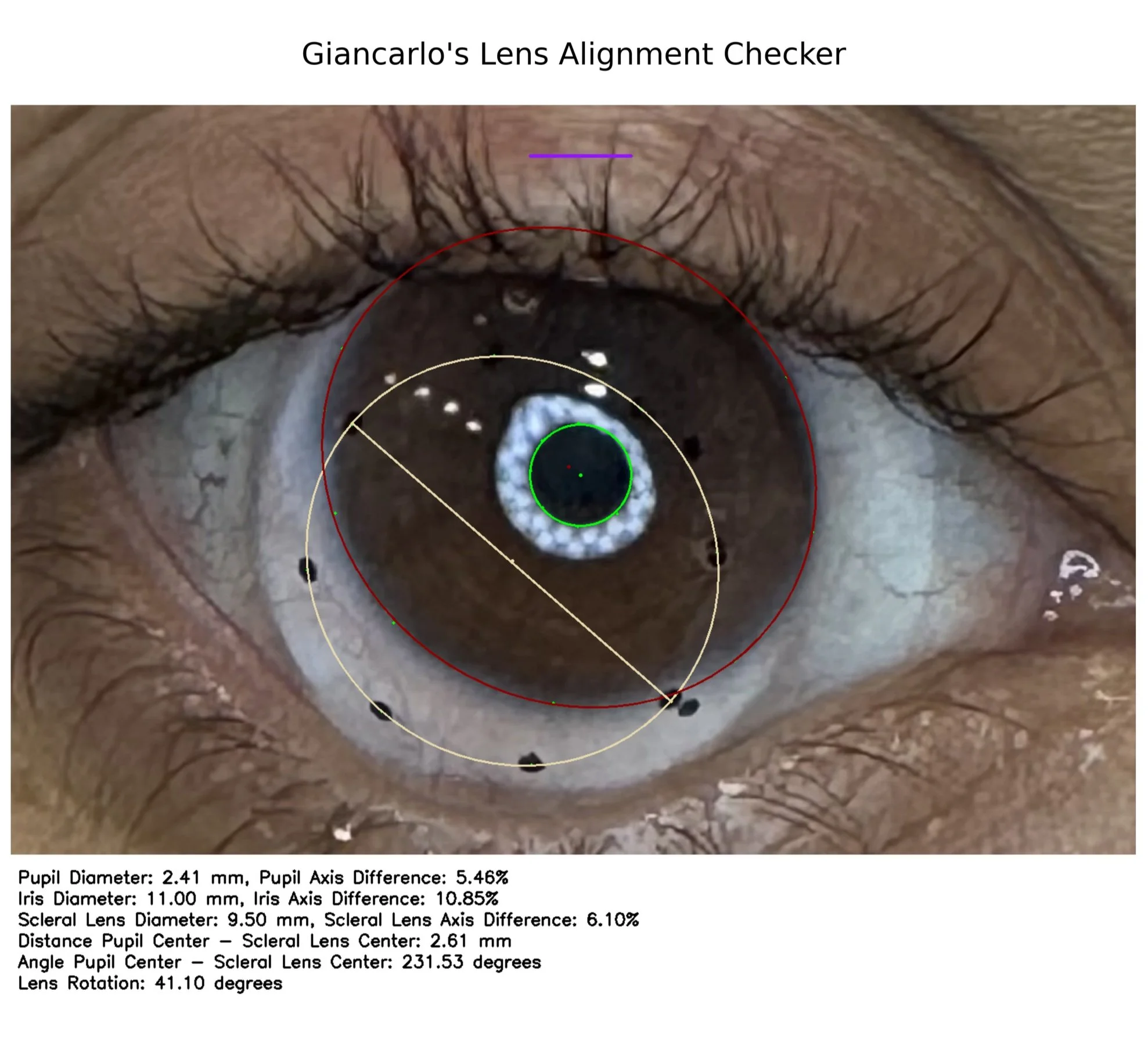 This project centers around a custom-built software tool designed to analyze and optimize scleral lens alignment for precise fit and positioning. The software guides users to select key anatomical points on a 2D image, such as the pupil, iris, and scleral lens markings, captured with a standard phone camera. Leveraging advanced computer vision algorithms, it calculates critical metrics like lens centration, rotation, and deviation from the pupillary axis. By fitting ellipses and circles to these points, the program evaluates alignment accuracy and provides feedback on fidelity, offering a reliable and user-friendly solution for lens assessment.